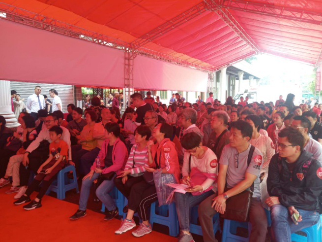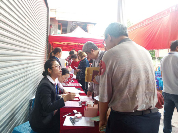 上午9點,簽到區已排長隊,在工作人員的指引下,陸續到來的業主有序地進行簽到。簽到人員認真審核業主資料,并派發臂貼號。