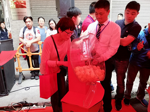 此次車位開盤僅對已認籌業主開放,搖號采用全透明搖號機。主持人邀請業主上臺將乒乓球號碼投入搖號機內,以保證搖號程序做到真正的公開、公平、公正。