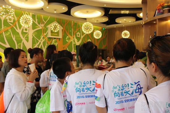 Around 9:30, a simple flag-giving ceremony was held. Aerobics team demonstrated warm-up exercise for all participants. The host invited 13 leaders and guests of Great Aim, Nanfang Metropolis Daily and the government onto the stage to push the rod and announce loudly the official start of "2016 All People Fitness Walk". Thousands of people ran joyfully out of the square behind the pace-maker and embarked on a 6-km loving journey. They passed Baipu Road, Qinglv North Road, and ran through the seaside peninsula and returned to the starting point.